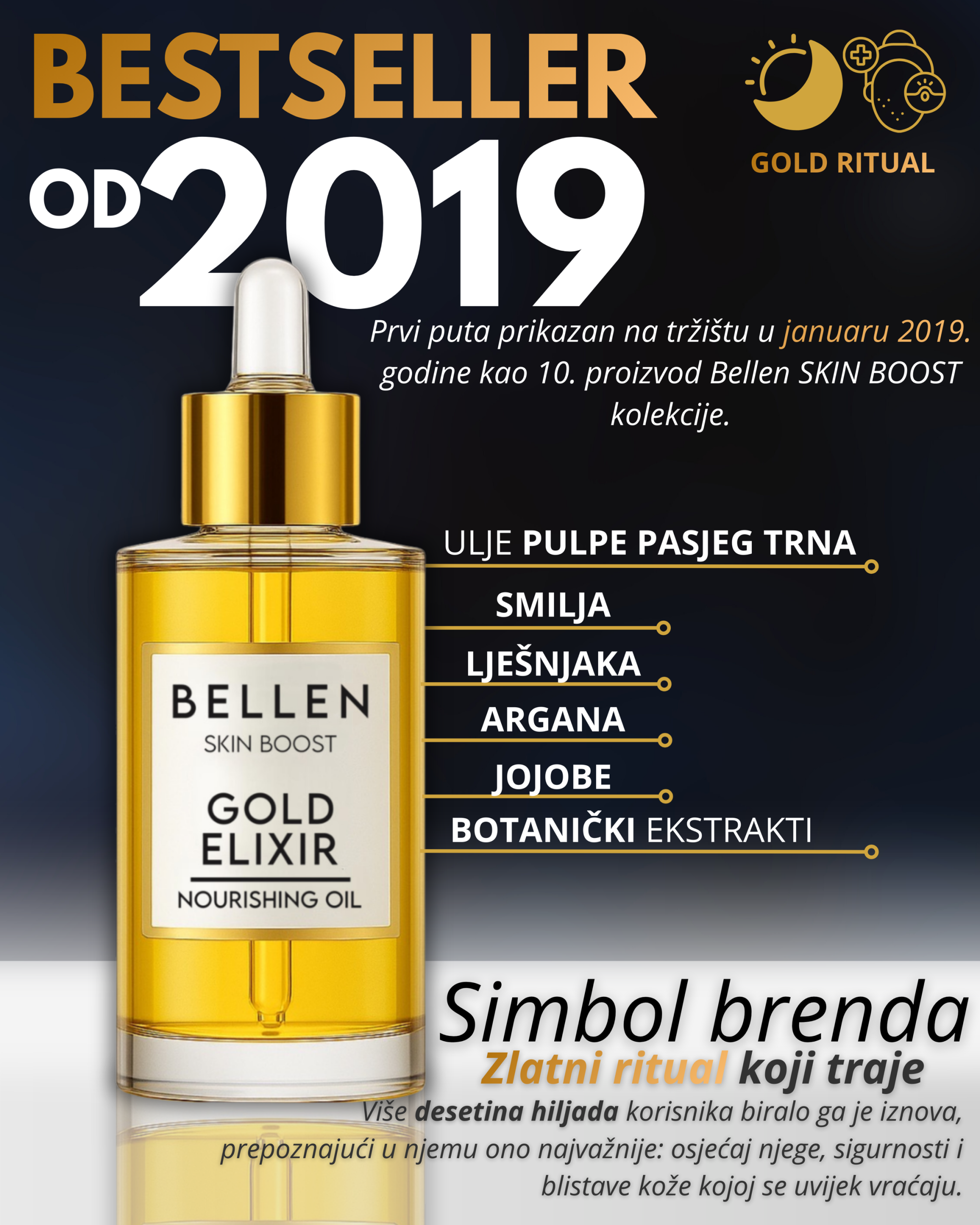 Gold Elixir je simbol Bellen brenda i jedan od najvoljenijih proizvoda u našoj kolekciji. Na tržištu je od 2019. godine i već godinama zauzima posebno mjesto u beauty ritualima hiljada korisnika koji mu se uvijek iznova vraćaju.